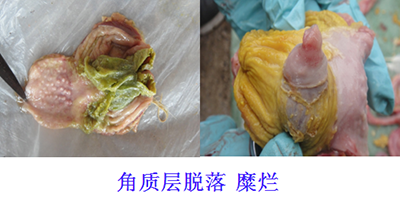 谷鳳柱教授還說,肌胃炎多和腺胃炎同時發(fā)生,但也可單獨發(fā)生,且對雞的危害大于腺胃炎。由于病因不同,臨床肌胃角質(zhì)層的病理變化也不盡相同。臨床上經(jīng)常看到肌胃角質(zhì)層的糜爛、崩解一定是發(fā)生了肌胃炎,但角質(zhì)層沒有糜爛不一定不是肌胃炎,要認(rèn)真辯證分析。如果發(fā)現(xiàn)角質(zhì)層已經(jīng)發(fā)生褪色、變淡,那么我們就應(yīng)該注意了。